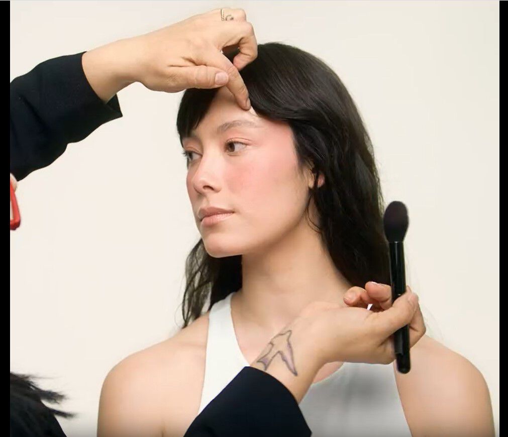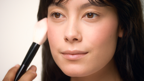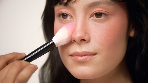 Apply Luminous Silk Glow Blush #50 to create a natural “flushed” look across cheeks and face with a full brush.